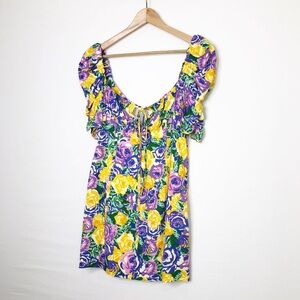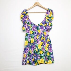 Zara multicolored floral, puff sleeve, mini dress fully lined ties at the front and zips up at the back