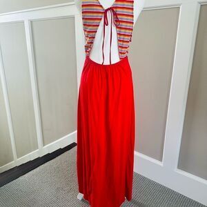 Elevate your summer style in this color block maxi sun dress by Zara with striped top, solid orange skirt and open back accent with tie closure. Cotton and spandex blend. Length 54” x Width 17” pit to pit.