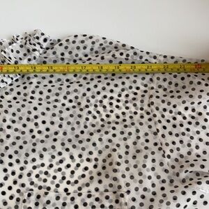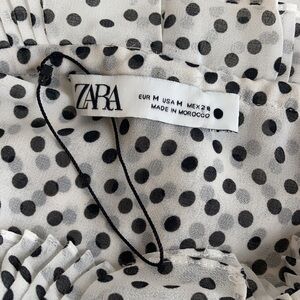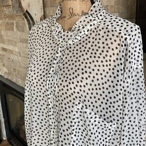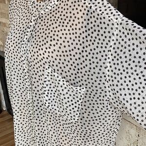 Great condition Zara white sheer with black polka dot oversized button down blouse. High ruffle neck. Two button closure at wrist. Cute tie at back of neck. Pocket.