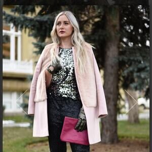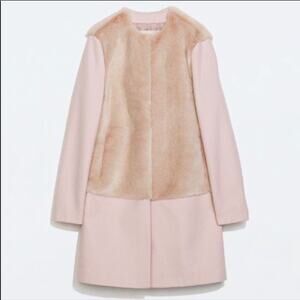 Blogger favorite. Pink pea coat. Polka dot interior. Fur accents front and back. Blush. Wool blend. Overcoat. Fall winter coat. Stylish. Blogger pick. Zara trends. Chic