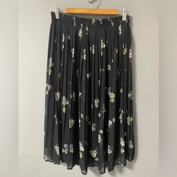 Elastic waist pull on style skirt. Floral print with a black background. Midi length. Lined. 100% polyester.