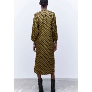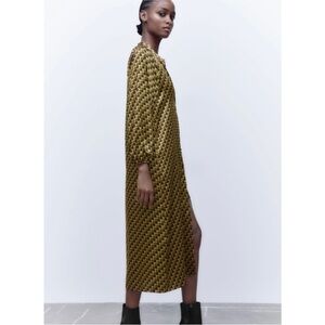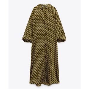 Round collar midi dress with V-neck front and long sleeves with elastic cuffs. Asymmetric hem. Front button closure.