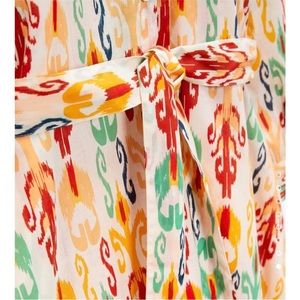 Long printed dress with lapel collar and cuffed long sleeves. Tied self belt.