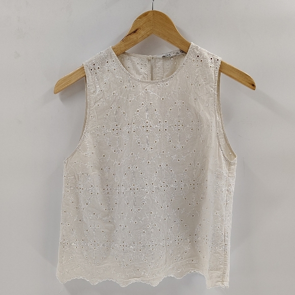 Zara pullover Cream Eyelet Size Large Top Sleeveless Cropped Blouse Cotton Blend