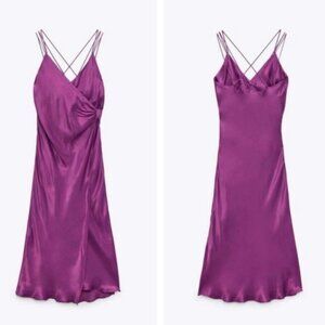 Zara purple Satin effect slip dress sweetheart spaghetti strap faux wrap Sz L