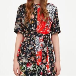 Zara red orange black white floral tie waist asymmetrical hem top. Pullover style with round neckline. Color block floral material. Panels that wrap and tie at waist. Keyhole opening at back neckline. Asymmetrical draped hemline. Size Medium. Excellent preowned condition. Minor wash wear. One tiny spot on front. Material content tag has been removed.