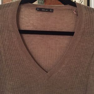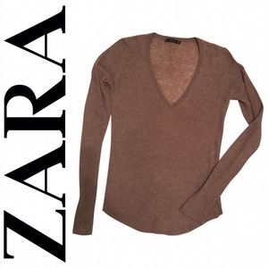 Zara ribbed v-neck sweater size small. Tag is cut out that lists materials, but feels like a thin wool blend. Only wore a handful of times, excellent condition. Brown/beige color