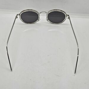 Round sunglasses with mirrored gray lenses and silver tone metal frames. Frames have some discoloration/tarnishing around the edges, as shown in photos. Lenses are in great shape.