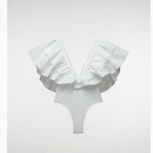Sleeveless V-neck swimsuit. Tonal matching maxi ruffle detail.