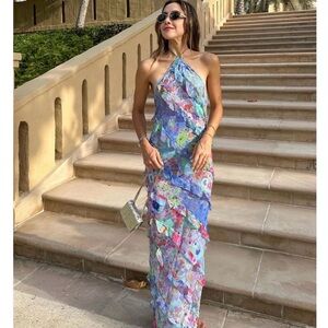 This dress is giving so much Y2K vibes. Embrace elegance with this stunning floral halter maxi dress. The vibrant blue and pink hues create a captivating look perfect for any occasion