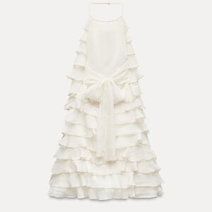 Short halter neck dress with button. Ruffle detail. Open back with tie. Tonal interior lining.