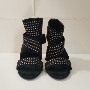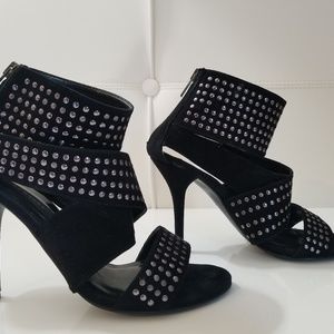 Very comfortable black suede,studded sandals, back zipper,4" Heel,pre-owned, missing a stud on the ankle strap as shown in the picture