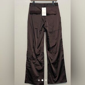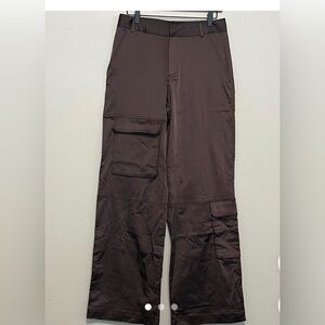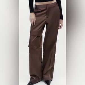ZARA elegant satin cargo utility pants in a rich chocolate brown. Designed in a relaxed, slightly wide-leg silhouette with a luxe satin finish, cargo pockets. Effortlessly combines utilitarian edge with sleek satin polish.