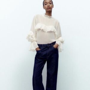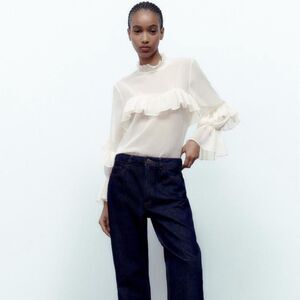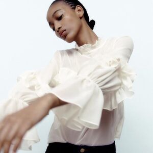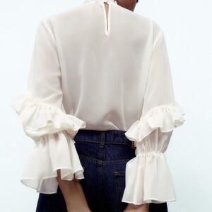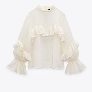 High collar blouse with long sleeves with elastic cuffs. Ruffled trim.