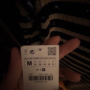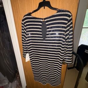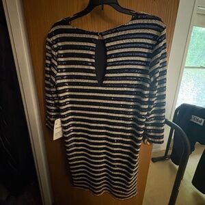 Brand new with tag attached Zara sequin short dress; striped with navy and white; 3/4 length sleeves; size Medium (M)