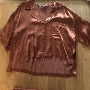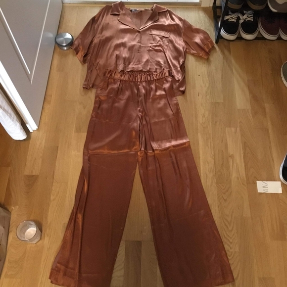 zara set. burnt orange. satin/silk look. button up, short sleeve top with long, wide leg bottoms. slit at bottom of each leg. elastic waistband on pants. top is cropped at front and a bit longer at the back. both pieces are size medium. only worn one time; in great condition.