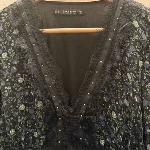 Zara sheer balloon sleeve ditzy floral and lace green/black dress size small