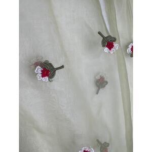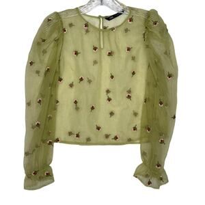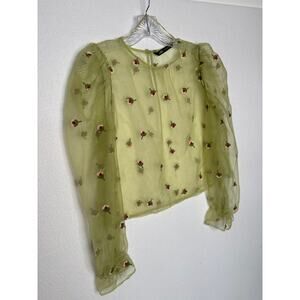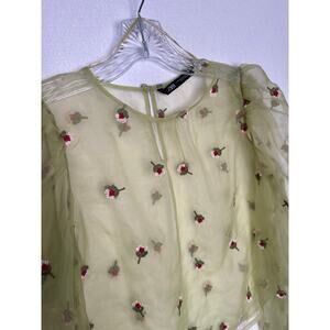Zara sheer sexy green Embroidered Organza blouse with red roses medium