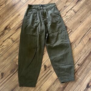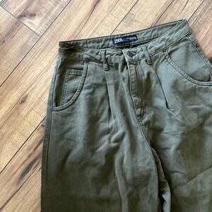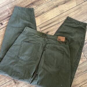 Zara size 6 green baggy mom jeans in great condition. I can’t find a fabric tag but appear to be mostly cotton. Not much stretch. Waist is 13 1/2” across. Inseam is 26” and rise is 12 1/20.