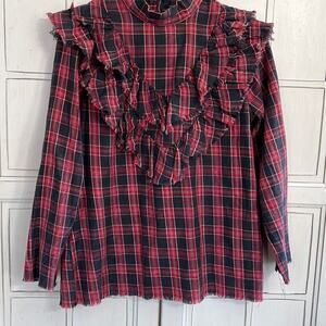 Zara size small plaid flannel popover top in excellent condition. Red and gray. Buttons part way up the back. Rae hems. Super cute! Measures 20” from armpit to armpit and 26” long.