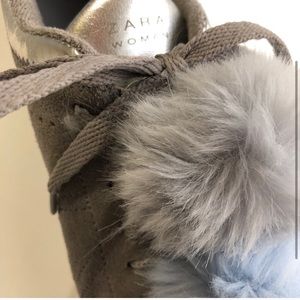 Gray fashion sneakers with soft leather uppers and large pompoms covering the laces. Barely worn, in like-new condition: Minimal wear to the leather, and the pom poms are perfect. Bottoms are dirtied but still very sturdy, no worn out areas.