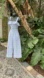A seersucker cotton in a navy and white stripe. Button down front is merely decorative, but there’s a lovely ruffle with the stripes going on the diagonal. Throughout the piece, the stripes are on the vertical and in the placket and waist sign their horizontal. This is a crop plank cotton blend in excellent condition.