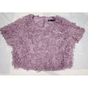 Zara sz M Textured Crop Top Short Sleeve Fuzzy Shaggy Pink Party Blouse Festival