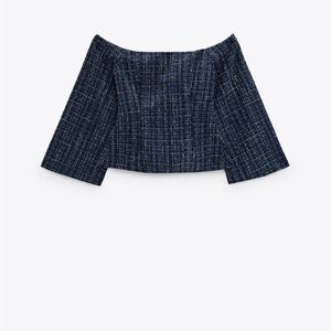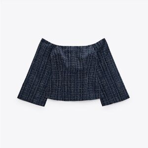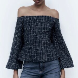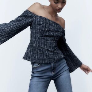 Off the shoulders straight neck top with long sleeves. Hidden in-seam side zip closure.