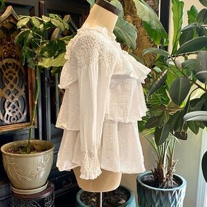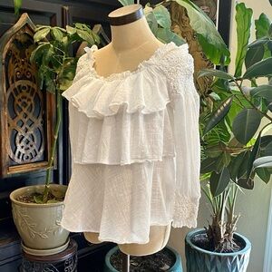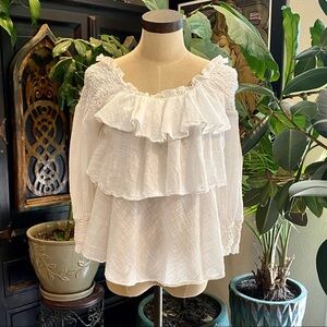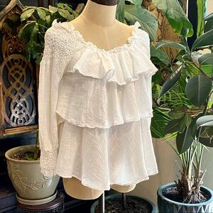 Zara tiered ruffle smocked off shoulder peasant top. A gauzy effect. Smocked gathered sleeves and shoulders.