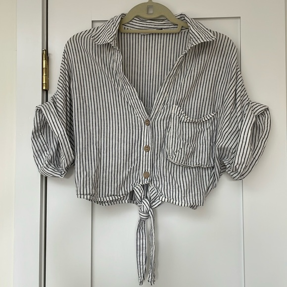 Zara cropped top tie at waist; pocket front left side; cuffs at sleeves; nice detail on back (see photo) 50% linen/50% viscose