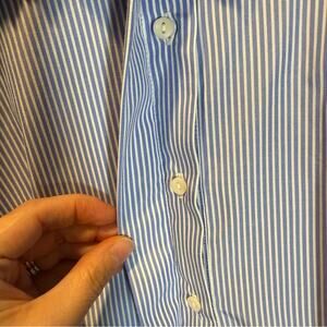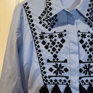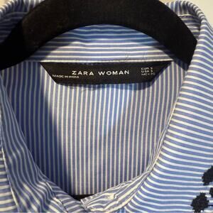 Zara top blue and white stripe with black embroidery size Small has hidden buttons, embroidery on the front, on the cuffs and the collar. Fun tassels. The shirt is a line meant to be worn in tucked, it flares at the waist for flattering fit. Measurements pit to pit 19 length 27.5 in good condition with no stains or tears