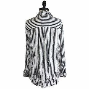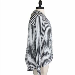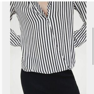 Black and white striped crossover blouse from Zara. Button cuffs. Pull over style. Lower in back