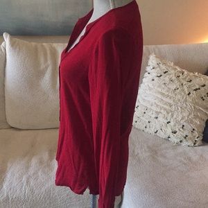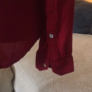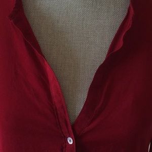 Deep red tunic. Buttons down the front. Buttons at cuff. Shirt tail hem. 100% rayon. Size S