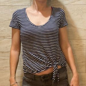Zara v-neck, blue & white, striped, shirt w/ bottom tie-off, Your summer look!!! Asher it was only worn once for a selling party and has been on this. I love it but it’s time to pass it on in my spring cleaning! This shirt has no rips, stains, blemishes of any kind, or anywhere in tear that makes it visible that it was previously worn!!