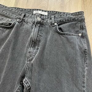 Zara washed Black grey Straight tapered heavyweight denim jeans 32 excellent. No material tag but almost certain 100% cotton no stretch. Around 27.5” inseam tapered at ankle