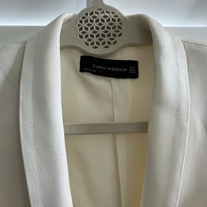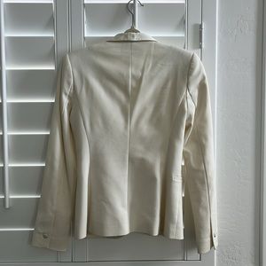 White with satin lapel and buttons. Tailored style. Size XS. Very small smudge on elbow. Can’t see while wearing. 22.5” from shoulder to hem.