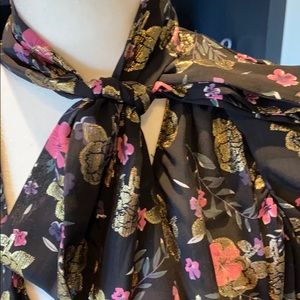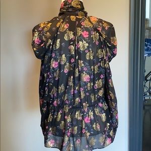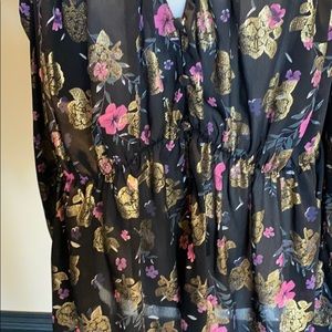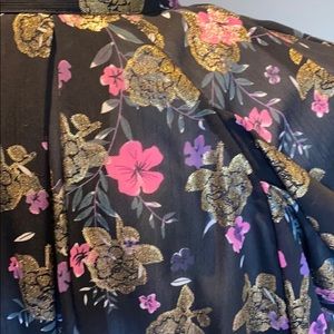 Zara blouse size xl black with gold and pink flower print meant for a loose fit bottom across the front ties around the neck or looser across the front ! Long sleeved and looser around the waste line ! 100% polyester beautiful and in perfect condition no stains no rips like new!