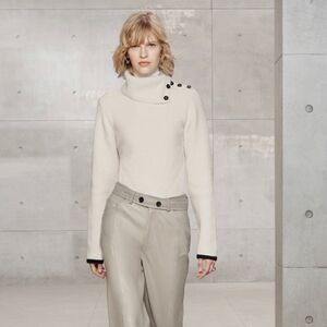 Sweater made of 100% wool. Turtleneck and long sleeves. Contrast trim. Shoulder button closure.