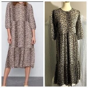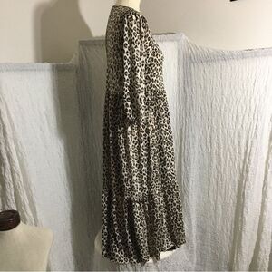 Cheetah print midi flowy skirt dress. High round circle neckline. It has 3/4 sleeves. Empire waist line. Pre-owned in great condition. Please refer to pictures for best description and condition verification.