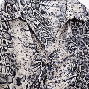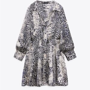 Mini dress with V-neck lapel collar and long sleeves. A-line silhouette. Front button closure.