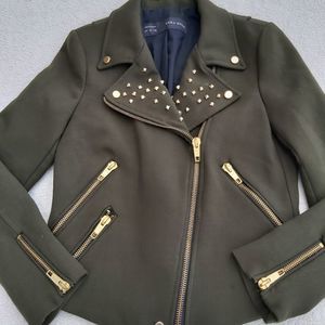 Zara Basic Studded Green Wool Moto Jacket L Zip