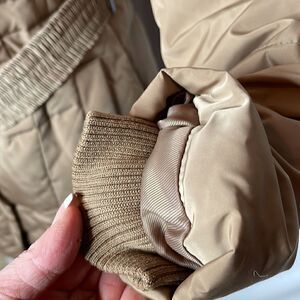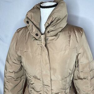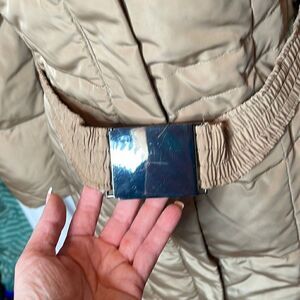 Zara Basic Down Puffer Jacket. Size Small. Color: gold. Belted at waist. 70% down feathers. Has two very small marks. One on sleeve and one on chest as shown in pictures. Hard to see when wearing. Very good used condition.