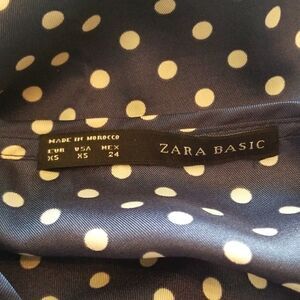 This is a navy polka dot blouse by Zara Basic. There is a bar across a keyhole opening on the chest, and cap sleeves.