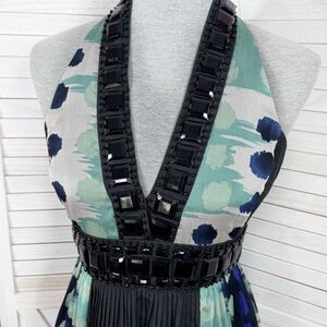 Zara Beaded Silk Pleated Multi Pattern Fit Flare Halter Dress Black Teal Medium