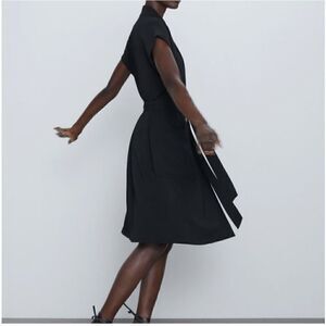 Long dress with V-neck lapel collar. Front patch pockets. Tonal tied belt. Front double breasted button closure.