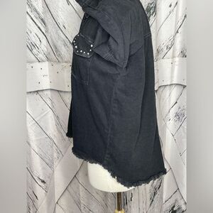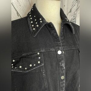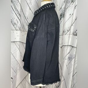 This oversized distressed black denim jacket has a frayed high/low hem. The collar and breast pockets are embellished with rhinestone and silver studs.