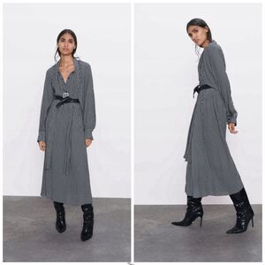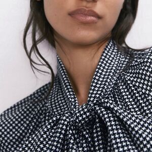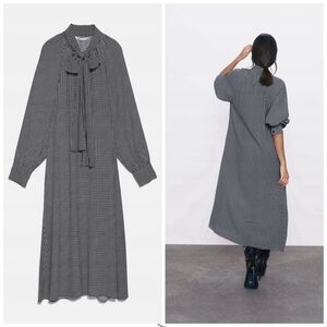 Chic long sleeve dress with a checkered pattern. Features a stylish tie at the neck. Perfect for a sophisticated look.