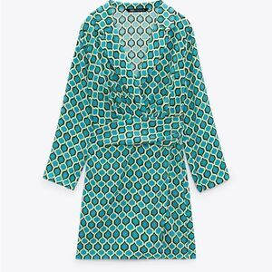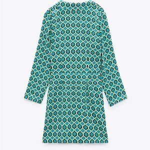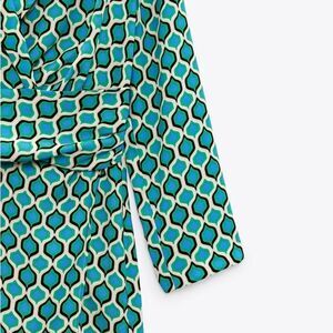 Long sleeve blazer dress with V-neck lapel collar. Pleats and ruching at waist. Side hidden in-seam zip closure.