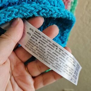 This is a blogger's favorite crocheted cardigan by Zara. It is blue, green, pink, and white striped with blue buttons. Note one small spot of discoloration near the button panel as shown in the photos. This cardigan does not come with the matching crop top.