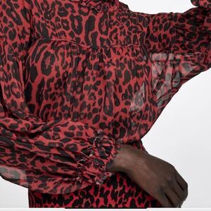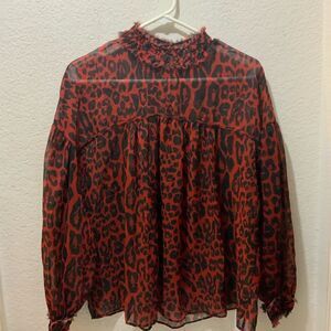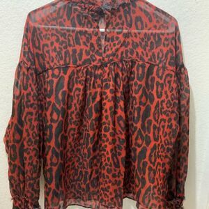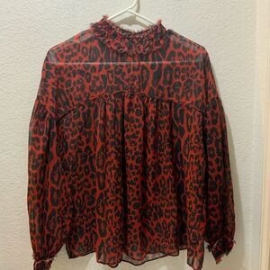 Zara Blouse Womens Small Red Black Cheetah Print Mock Neck Flowy Sheer Top